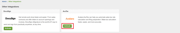 In order to integrate with AvaTax, go to Admin=>Other Integrations then click the Activate button.