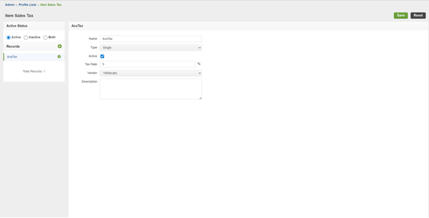 To create a new Item Sales Tax, navigate to Admin => Profile List => Item Sales Tax.